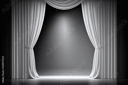 Empty stage, open white curtains, minimalist background for display