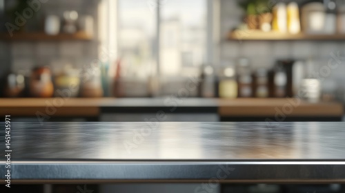 Empty stainless tabletop with blurred kitchen view background.