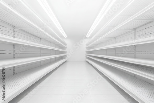 Empty supermarket aisle, bright white interior. Shelves and floor are monochrome, creating a clean, modern space