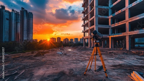 Empty surveying equipment set up in front of a half-built high-rise structure at sunset