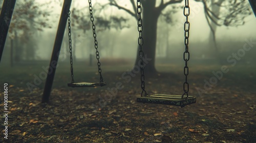 Empty Swing Set in Foggy Park with Fallen Leaves Landscape