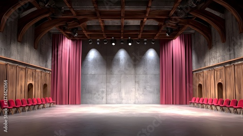 Empty Theater Stage with Red Curtains and Dramatic Lighting in a Modern Interior Design