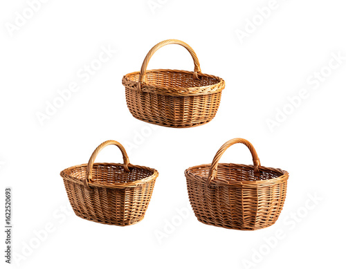 Empty, traditional wicker picnic basket with a handle, handmade and woven from natural straw, isolated on a white background