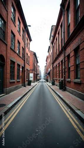 Empty urban background featuring a deserted street lined with old brick walls, pavement, rundown