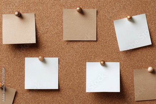 Empty white and brown sticky notes pinned on a corkboard for reminders, planning, organization, or creative workspace concepts.