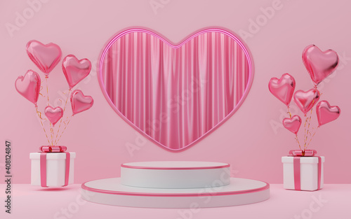 Empty white cylinder podium with pink border, gift boxes, hearts balloons on neon lamp arch and curtain background. Valentine's Day interior with pedestal. Mockup space for display. 3d render.