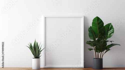 Empty white frame on the wall with green plants, simple background and wallpaper collection, poster mockup