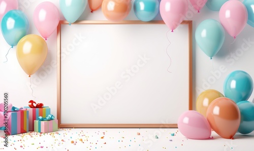 Empty white frame with balloons and birthday decorations. Free space for text.