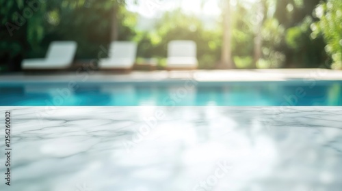 Empty white marble tabletop for product presentation on blurred background of swimming pool with lounge chairs
