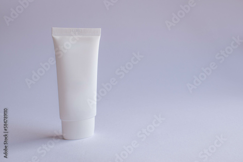 Empty white plastic tube on a white background. Layout of cosmetic product branding. Space for copying. High quality photo