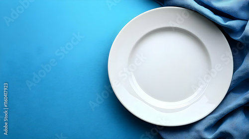 Empty white plate on blue textured background neatly placed on textured napkin for elegant table setting.