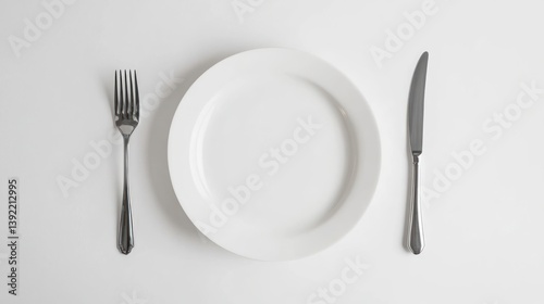 Empty white plate with fork and knife on white background