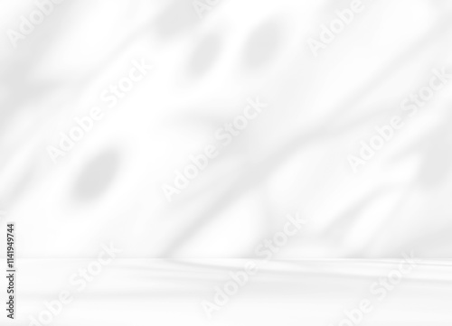 Empty white room studio with olive tree shadow overlay effect for product presentation display. Cosmetic beauty fashion showroom. Sunlight through the window. Minimal Mock up interior background.
