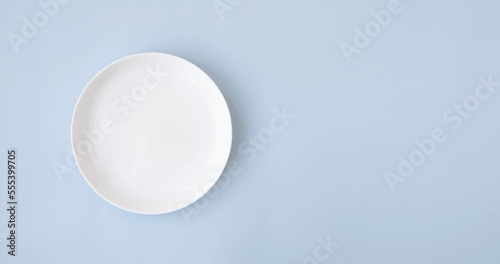 Empty white round plate dish blue pastel background. Mockup template for product item or text