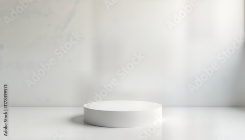 Empty white round podium stands in simple studio scene. Clean, minimal design perfect for product presentation. Modern, light backdrop creates calm atmosphere ideal for advertising promotional
