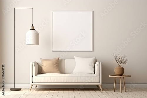 Empty white vertical frame in modern minimalist interior with trendy lamp and sofa on beige wall background, design interior idea - Generative AI