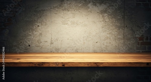 Empty wood shelf, grunge industrial interior Uneven diffuse lighting version. Design component