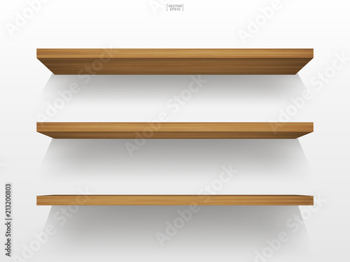 Empty wood shelf on white background with soft shadow. 3D empty wooden shelves on white wall. Vector.