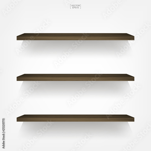 Empty wood shelf on white background with soft shadow. 3D empty wooden shelves on white wall. Vector.