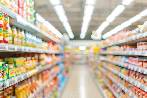 Empty wood table top with supermarket grocery store aisle and shelves blurred background