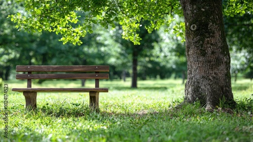 Empty Wooden Bench in Lush Green Park with Tree Summer Nature Scene