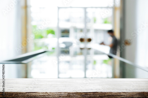 Empty wooden desk space and blurry background of home window for product display montage.