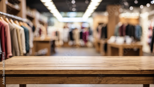 Empty wooden desk with blurred background of clothing store.