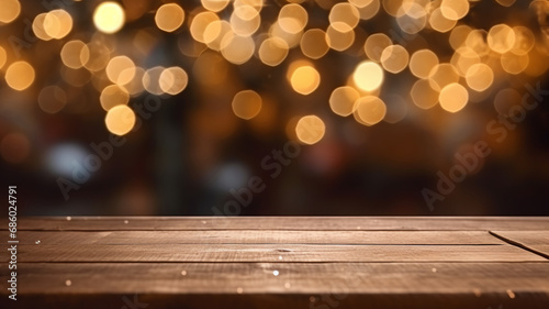 Empty wooden plank table top with festive fireworks, bokeh light background in the sky party holiday celebration.