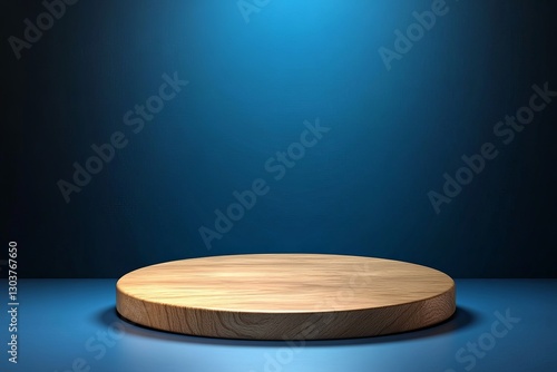 Empty Wooden Round Platform Product Display Stage Minimalist Blue Background Modern Showcase Wooden Podium Presentation Template Clean Simple Design