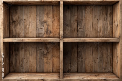 Empty wooden shelf with four compartments and rustic design, perfect for storage or decoration in homes, offices, or shops.
