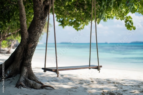 Empty wooden swing hanging from a tree on a tranquil tropical beach.
