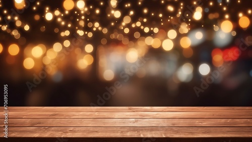 Empty wooden table and bokeh lights background. For product display
