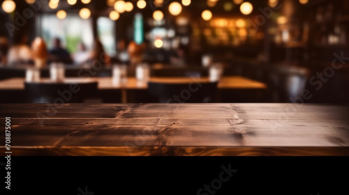 Empty wooden table and Coffee shop blur background with bokeh image.