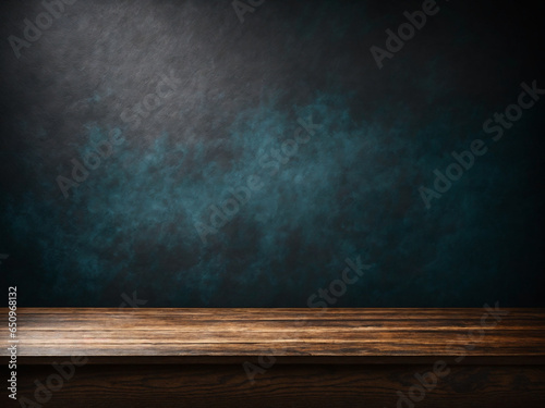 Empty wooden table and grunge wall background, product display montage. AI-Generated