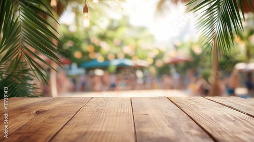 Empty Wooden Table at a Beach Party Scene with Palm Tree Background