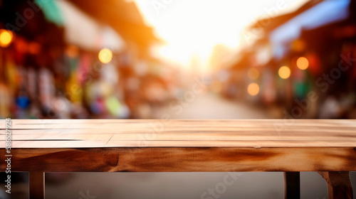 empty wooden table in front of abstract blurred background for product display in a coffee shop, local market or bar. Generative AI