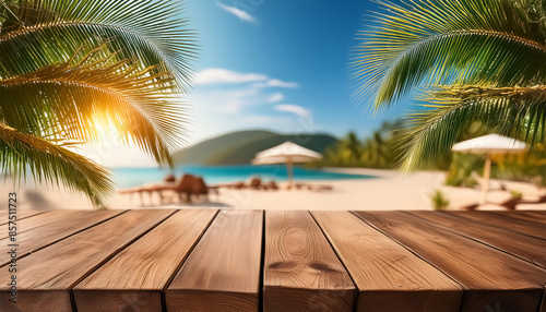 empty wooden table on the beach among palm trees