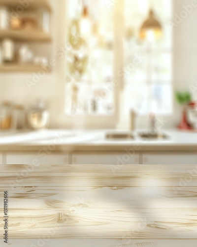 Empty wooden table surface in bright sunny kitchen with blurred background, natural sunlight through windows creates warm atmosphere for product display.