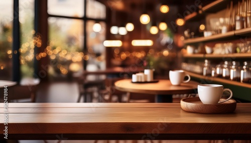 Empty wooden table surface with blurred background in coffee shop. product display. Generated image