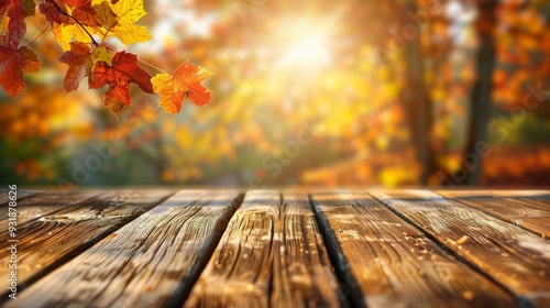 Empty wooden table top and blurred autumn tree and red leaf background