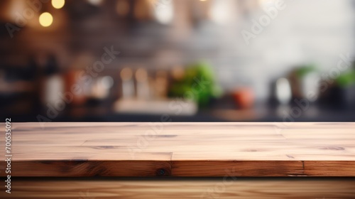 Empty wooden table top counter with bokeh kitchen interior background. Ready for product montage and banner