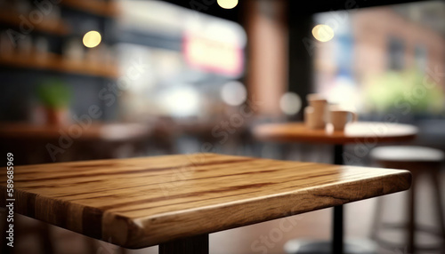 Empty wooden table top for product display with blur luxury cafe. generative AI
