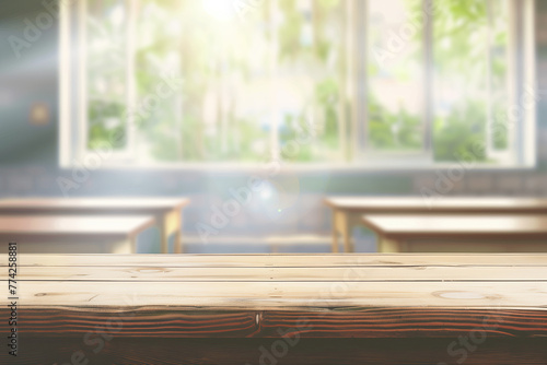 Empty wooden table top with a blurred background of a classroom and window in the morning, a panoramic banner for product display montage. A school concept. A product for display montage