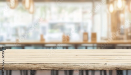 Empty wooden table top with blurred background for product display in a dining or coffee shop interior.