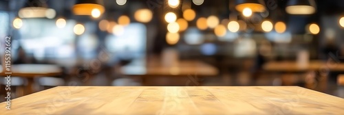 Empty Wooden Table Top With Blurred Defocused Lights Of Cafe Restaurant In Background