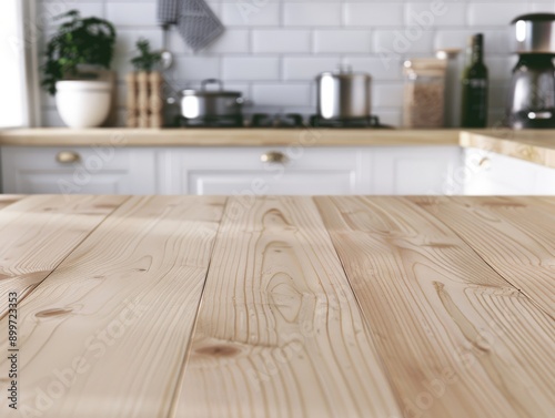 Empty Wooden Table Top With Blurred Kitchen Background For Display