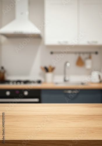 Empty Wooden Table Top With Blurred Modern Kitchen Background