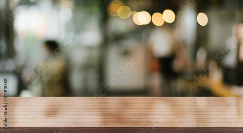 Empty wooden table top with lights bokeh on blur restaurant background.