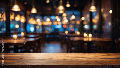 Empty wooden table top with lights bokeh on blur restaurant background.