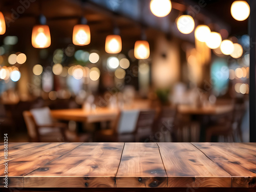 Empty wooden table top with lights bokeh on blur restaurant background.